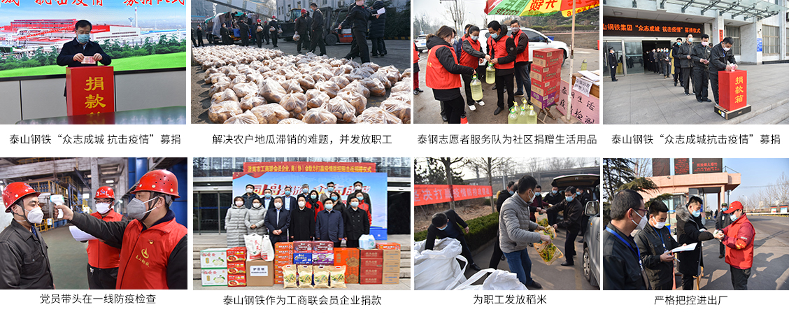 1999年3月泰山鋼鐵積極響應全國號召向新疆貧困地區捐贈共計5000件保暖衣物;2001年3月在市總工會發起的為患白血病女學生支斐斐捐款26600余元;同年12月又向萊蕪市社會救助工作領導小組捐助單衣3290件、棉衣3000件;2012年2月向市教育局捐助貧困生52385元;2003年1月在萊蕪抗旱救災中捐款81930元;2004年5月在全省慈心一日活動中捐款10萬元;2005年1月向海嘯災區捐款66200元,同年6月又在全市慈心一日活動中捐款86800元;2006年11月在全市送溫暖、獻愛心活動中捐款86300元;2007年4月在全市敬英雄愛心獻功臣、修建萊蕪戰役紀念館活動中捐款18萬元;2008年5月汶川發生強烈地震,泰山鋼鐵踴躍伸出之手奉獻愛心,支援抗震救災,累計捐款120萬元;在2009年7月份全市慈心一日活動中捐款164351元;2010年4月玉樹地區發生地震,泰山鋼鐵積極響應全國號召,在第一時間向震區捐款55萬元;在時下疫情期間捐助100萬元物資,三次組織職工捐款……長期以來,泰山鋼鐵為社會慈善公益事業、各類災難捐款累計達1.5億元,做出了突出貢獻,樹立了良好口碑。